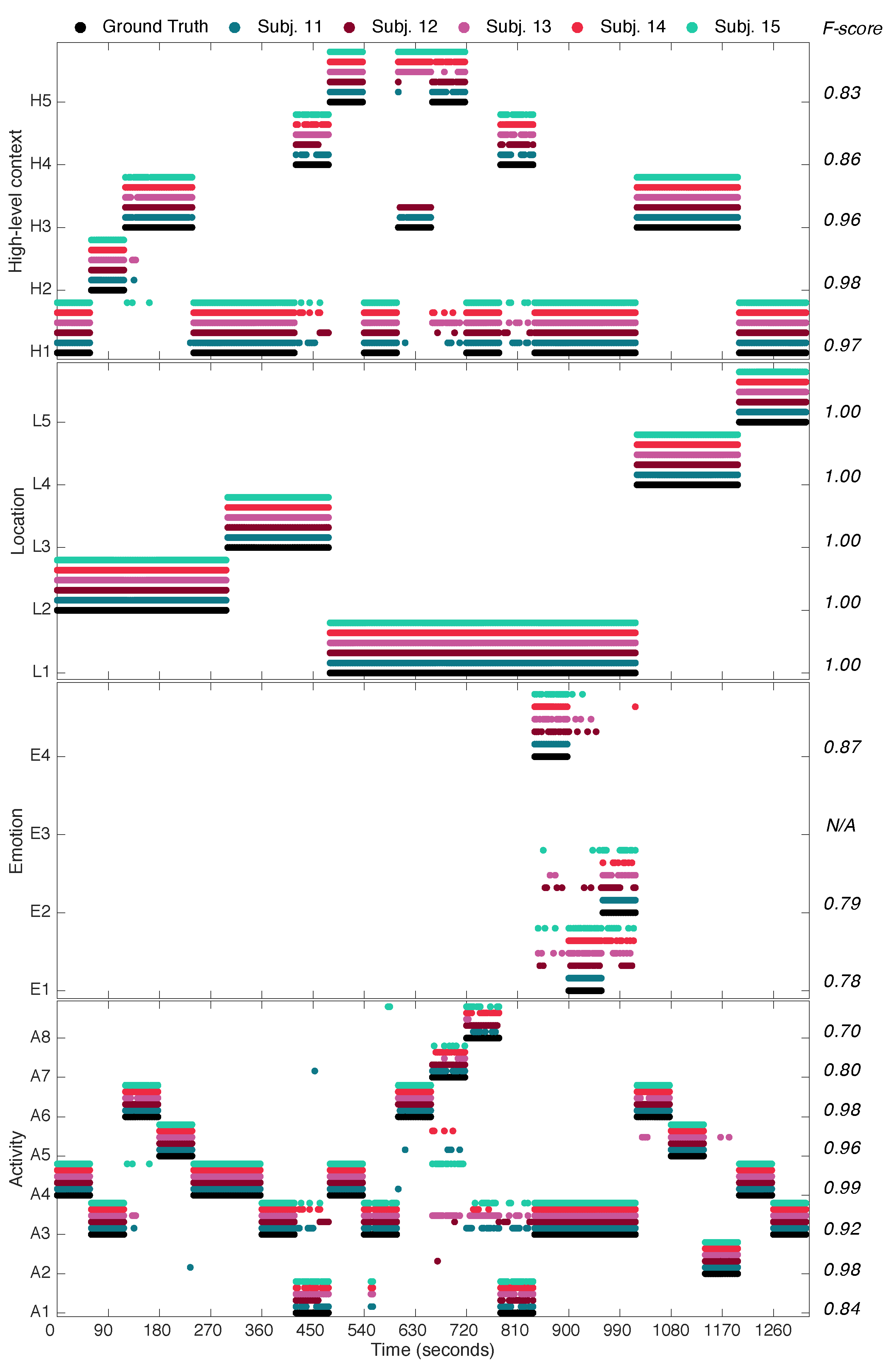 Low- and high-level contexts detected by the multimodal context mining system during online evaluation for the subjects S11–S15. Actual contexts are given by the ground-truth labels. Overall performance for each context and across all subjects is given by the corresponding F-score. Legend: A1 = Eating, A2 = Running, A3 = Sitting, A4 = Standing, A5 = Walking, A6 = Stretching, A7 = Sweeping, A8 = Lying Down); E1 = Anger, E2 = Happiness, E3 = Neutral, E4 = Sadness; L1 = Home, L2 = Office, L3 = Restaurant, L4 = Gym, L4 = Mall; H1 = Inactivity, H2 = OfficeWork, H3 = Exercising, H4 = HavingMeal, H5 = Housework.
