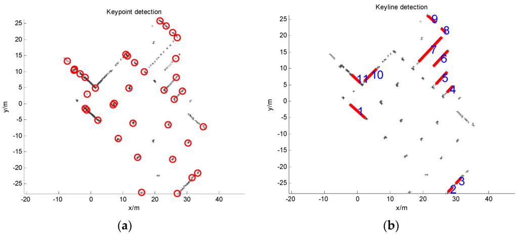 Point and line features detected from a laser scan. (a) feature point detection; (b) feature line detection.