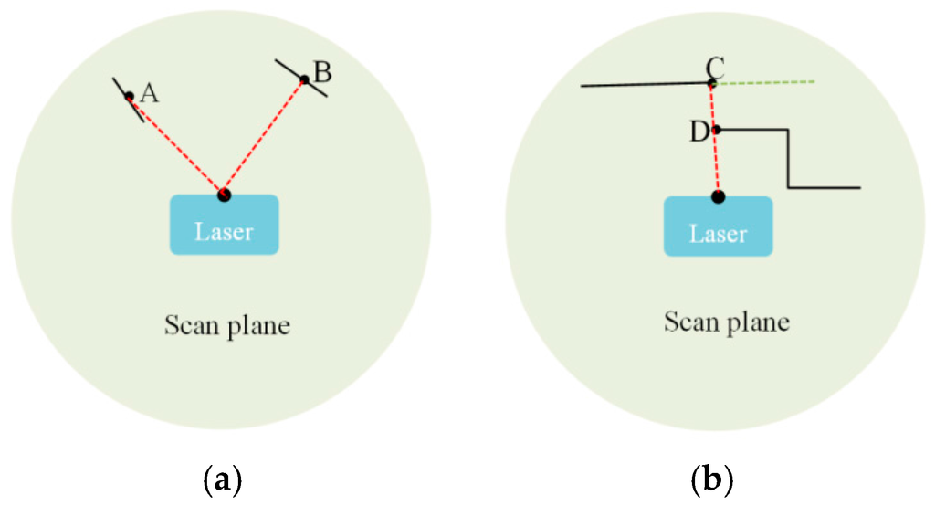 The black solid lines are the local surface patches of feature points; the red dotted lines are the laser beams; the green dotted lines represent the occluded region. (a) The direction of point A’s local surface patch is almost parallel to the laser beam, so the location accuracy of point A is very limited; (b) There is a gap between point C and point D, so point C may be occluded in the next scan. Point A and point C are both rejected as unreliable feature points in our approach.