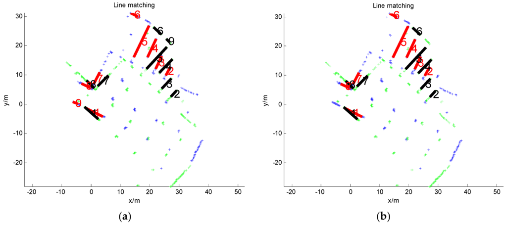 where stands for the line descriptor; score is the matching score; and represents the Euclidean distance. The feature line fl(k,j) ∊ Lk that achieves the best matching score will be accepted as the potential correspondence of fl(k-1,i). We then check the lengths of fl(k-1,i) and fl(k,j). They are discarded as outliers if their length difference is very large because the line correspondence pair in laser scans usually has similar Sk-1 lengths. Figure 4a shows a sample result. As seen, most feature lines are correctly matched. However, there are still some outliers, such as line correspondence 9. Because the Lk relationship between laser scans and Sk is rigid transformation, the angles or rotations between the correct 2D line correspondences are almost the same. Thus, we first cluster the angles of line correspondence via the histogram technique. The average angle of the largest cluster is regarded as the correct relative rotation between Sk-1 and Sk, formatted as matrix . The correspondences with angles that are inconsistent with are rejected. We then rotate the line segments in and calculate the middle point distance between the remaining matches. The correspondences with middle point distances that are too different from others are also treated as outliers. The others are accepted as inliers (Figure 4b).