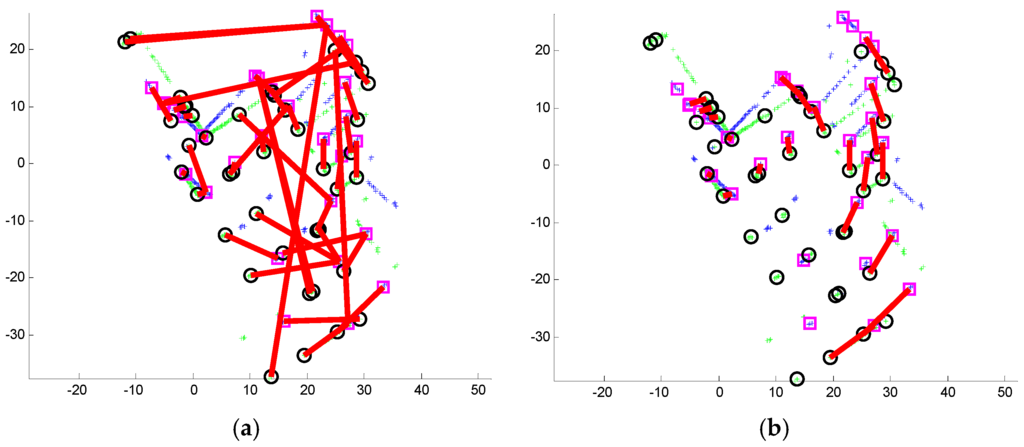 where stands for the feature point descriptor. The feature point fp(k,j) ∊ Pk that achieves the best matching score will be accepted as the potential correspondence of fp(k,i). As seen in Figure 5a, the points connected by a red line are potential correspondences. There are many false matches in the naive matching results. As we have obtained the rotation between laser scans Sk-1 and Sk in the last section, we can eliminate the rotation changes between these potential correspondences. Thus, there is only translation differences between these transformed matching points. In fact, the correct point correspondences should have almost the same translations. We cluster the translations in x and y coordinates. The average translation of the largest cluster in x and y is considered as the true translation between Sk-1 and Sk. The correspondences that are inconsistent with the translation are then rejected as outliers. The cleaned matching points are shown in Figure 5b.