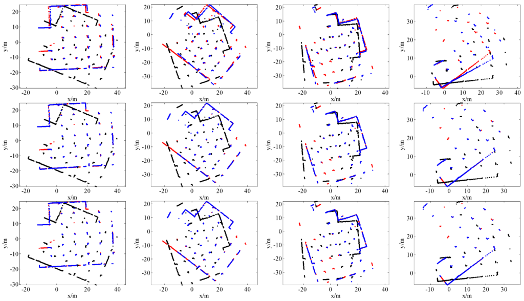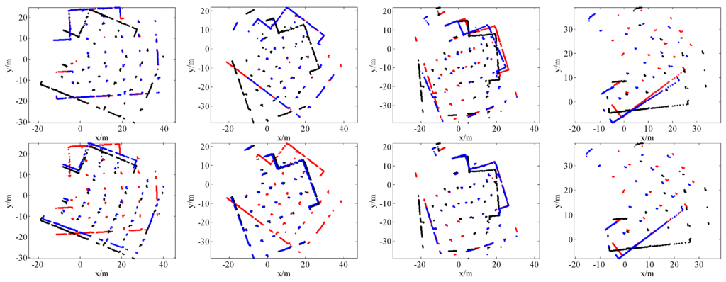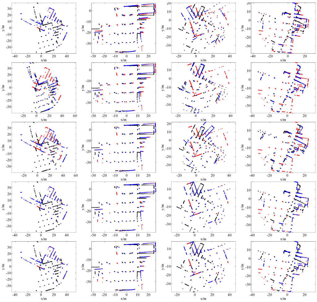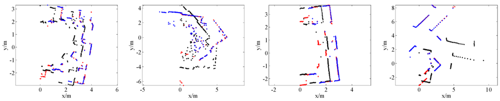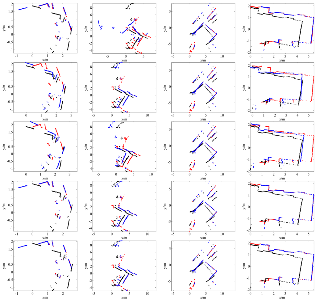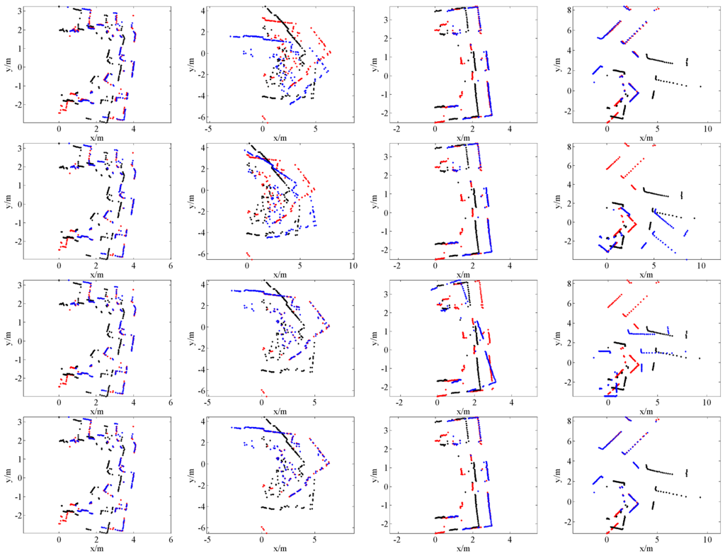 Some scan matching results of the MIT dataset. The first row is the results of PSM; the second row is the results of PLICP; the third row is the results of ICP without an initial guess (ICP1); the fourth row is our scan matching results; the last row is the ground truth. In all these plots, the points denoted by red +, black +, and blue + represent the first laser scan Sk-1, the second laser scan Sk, and the transformed laser scan of Sk by using the estimated transformation matrix, respectively.