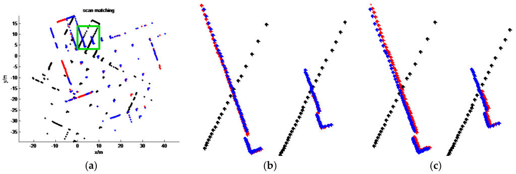 Table 1 and Table 2 show the quantitative evaluation results of our datasets. In the Tables, tx and ty represent the relative translation along the x-axis and y-axis between a laser scan pair, respectively; represents the relative rotation angle between a scan pair. In this evaluation, we regard the results of ICP2 as the approximate ground truth rigid transformation. PSM, PLICP, ICP1 and our method are compared with ICP2. From these tables, we can also draw similar conclusions as in the visual comparisons. As seen, our estimated transformations are almost the same as ICP2. The maximum angle difference between our method and ICP2 is less than 0.01 rad (0.573°). For most cases, the translation differences between our method and ICP2 are smaller than 0.05 m. The maximum translation difference is 0.09 m, which is the result of scan pair 3 in dataset 1. We enlarge the visual results of scan pair 3 (see Figure 11) and find that our result is even better than that of ICP2. The success rates of PSM, PLICP and ICP1 are 37.5%, 12.5% and 12.5%, respectively. Comparing ICP1 with ICP2, only the second scan pair is correctly matched; the translation differences are 0.07 m and 0.04 m, which are less accurate than our method. Even the translation differences of the third scan pair in dataset 2 are 0.13 m and 0.13 m, and their rotation difference is up to 0.05 rad (2.865°). ICP1 can succeed only for scan pair 2 of dataset 1, which can be expected because the rotation between this pair is small. Thus, the proposed method is much more reliable when the initial guess is unavailable.