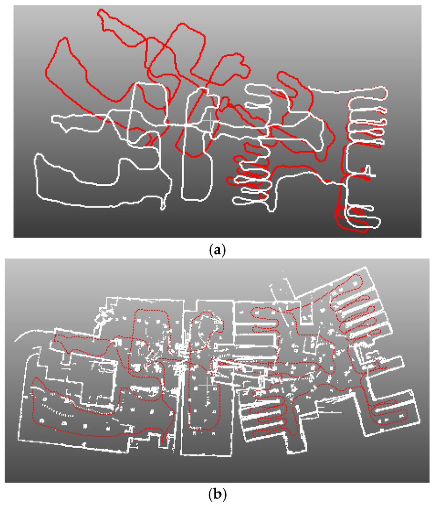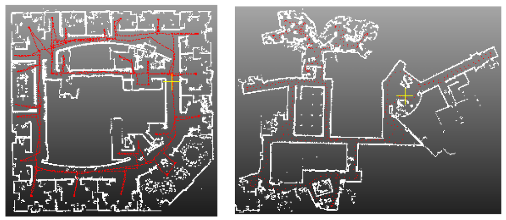 For each dataset, we first perform the proposed scan matching algorithm on all consecutive key laser scan pairs, obtaining the relative positions and orientations Tk-1 = {rk-1,tk-1} of these pairs. We choose the first key laser scan as the base on which to build a global map. The coordinate system of this global map is the same as the first key scan. We use Qk-1 to represent the points on the incremental global map, accumulated until the k-1-th laser scan. For a new laser scan Sk, we then match Sk with Qk-1 via ICP. The initial guess of ICP is provided by our method (Tk-1 = {rk-1,tk-1})). This transformation matrix Tk-1 = {rk-1,tk-1} is refined by this process, and more accurate relative positions and orientations are achieved. The global map is also updated by fusing the points of laser scan Sk. This map matching technique has a very important advantage: it is a global matching method, which can largely reduce the drift caused by scan matching methods. After all laser scans are processed, a 2D indoor map and a trajectory can be produced. Finally, this trajectory (positions and orientations) can be further optimized by some global optimization approaches such as G2O [34] or some filtering techniques. In this experiment, we regard the trajectory refined by the global map as the initial guess needed by particle filter SLAM (Gmapping [35]) and obtain a more accurate indoor map. We can also generate the 3D point clouds of the indoor scenes based on the other two laser scanners and the optimized trajectory.