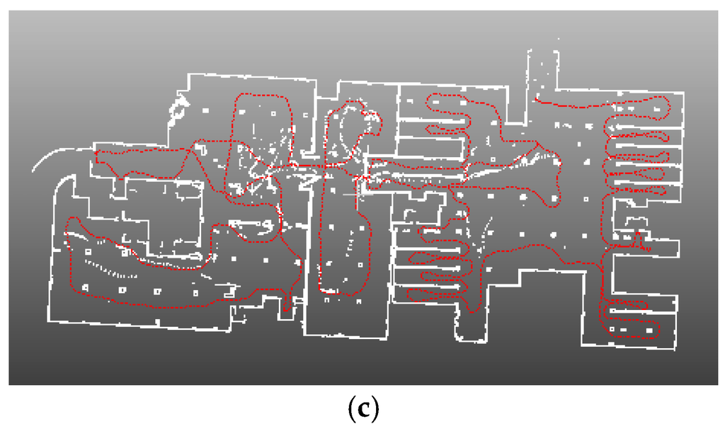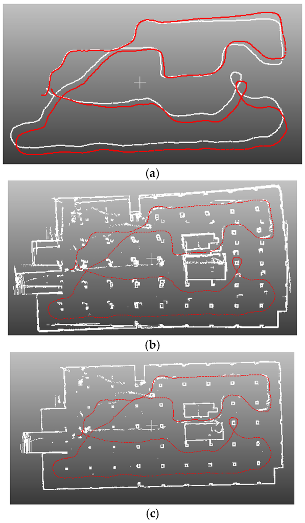 (a) trajectory comparison. Red line is the trajectory of our method before Gmapping refinement; white line is the result after refinement; (b) 2D map built by trajectory without refinement; (c) 2D map built by trajectory with Gmapping refinement.