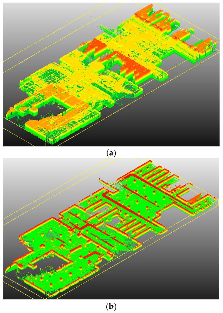 Figure 12 and Figure 13 show the indoor mapping results of dataset 1 and dataset 2, respectively. As seen, a smooth trajectory can be achieved by combining our scan matching approach with a map matching technique. There are no abrupt changes in the results, which indicates that there are no obvious false matches because the cart is moved at a near-constant speed. The unrefined trajectory has a similar shape to the global refined one. Its local accuracy is much closer to the global trajectory. The proposed method drifts over time, which could not be avoided by any scan matching method. From the second pictures in Figure 12 and Figure 13, we can see that the 2D point clouds have very high local accuracy. The thickness of the point clouds is less than 0.1 m in most cases. The point clouds represent the outline of indoor walls whose thickness is almost 0 in the ideal case. However, the range noise of the Sick laser scanner is 0.02 m, and the location error cannot be avoided. Thus, a trajectory that can construct a map with 0.1 m local accuracy is sufficient to provide a good initial guess for global refinement methods, such as Gmapping. The third pictures of Figure 12 and Figure 13 verify this conclusion. The thickness of the point clouds is less than 0.08 m in all cases. There is no “ghosting” in the maps, and the walls are straight. The constructed 2D maps are consistent with the real scenes. Figure 14 gives the final indoor maps of the Intel and MIT datasets. Figure 15 shows the 3D point clouds of dataset 1 reconstructed by the other two oblique lasers.