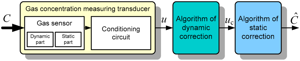 Shortening the response time of the transducer is also possible by the use of a correction procedure implemented by various methods in the next section of the measuring chain. Technical realization of such a correction may be relatively simple and does not necessarily entail the expansion of the measuring chain, because due to the static properties of the sensors (non-linearity, non-selectivity) a procedure of correction of these features is necessary in any case. The basic structure of a transducer to measure gas concentration is shown in Figure 1.