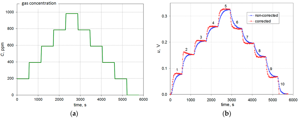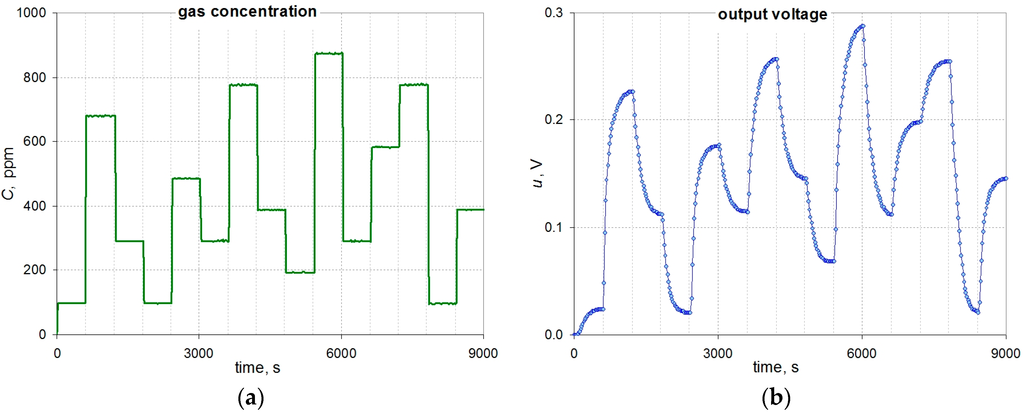 During the tests the gas concentration was changed abruptly as shown in Figure 3a. The resulting changes in the output signal are shown in Figure 3b.