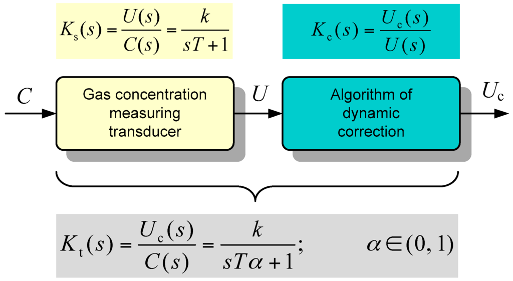 where C and u are measured gas concentration and output voltage, respectively (see Figure 1), t is time, T, T1, T2 (time constants), and T0 (delay time) are parameters related to the sensor dynamics, and the coefficient k (sensitivity) expresses its static properties. In the presented considerations, determining the sensitivity is not necessary because the subject of the correction are only the dynamic properties and the correction relates to the output voltage of the converter. Problems concerning the correction of the static characteristics of the transducer are discussed in more detail in [16].