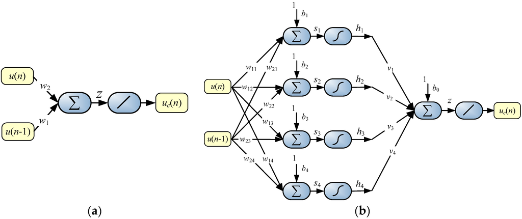 Structures of ANNs realizing real-time dynamic error correction (a) linear neuron in the case of the sensor model described by first order linear differential Equation (7); (b) 2-4-1 structure of the ANN which allows taking into account the non-linearity of the sensor’s dynamic.