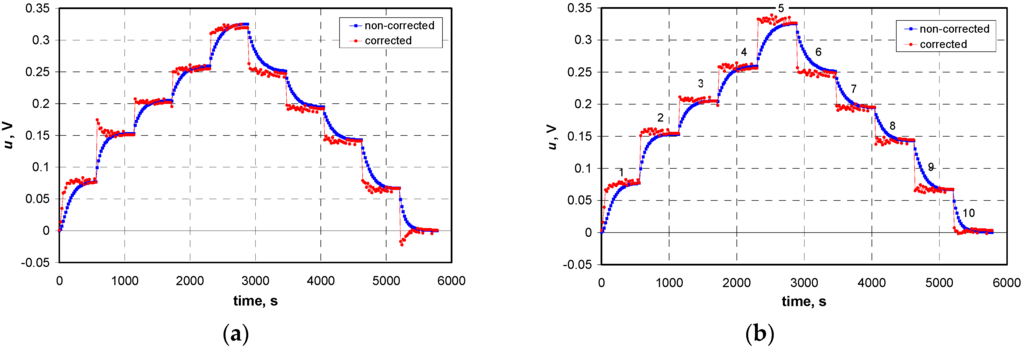 However, it should be noted that the ANN-based dynamic error correction is more sensitive to the random errors of input data than the algorithm proposed in Section 3 (Figure 9a vs. Figure 9b). In a situation when the corrected results contain random errors exceeding limit values several actions can be taken to reduce them. The simplest way is to increase the resolution of the A/D converter. There may also be different smoothing algorithms used or the sampling period may be increased. However, in both cases this leads to an increase in the time to obtain the measurement result.
