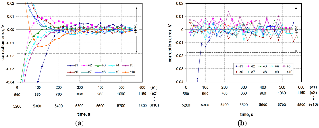 For a more detailed evaluation of the effectiveness of the proposed dynamic correction methods, an dynamic error e(t) has been defined as the difference between the voltage value obtained as a result of the correction uc(t) and the voltage value in a steady state, which corresponds to the measured gas concentration. Such calculated error values for the two described methods are shown in Figure 9. These methods were compared taking into account three main aspects: the degree of shortening the response time, the impact of the sensor dynamic non-linearity and the impact of random errors.
