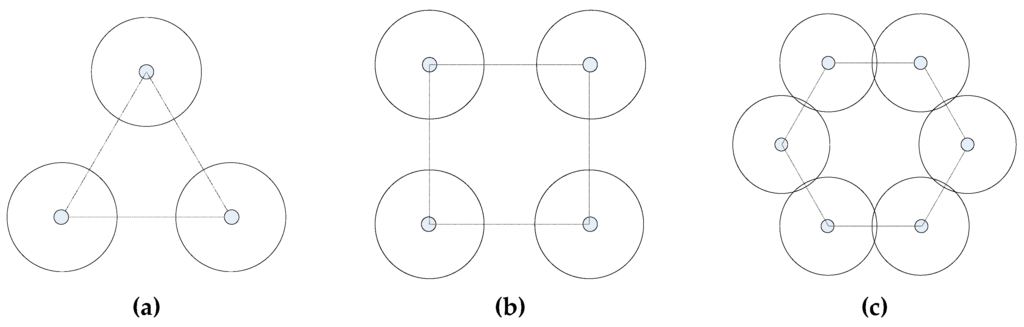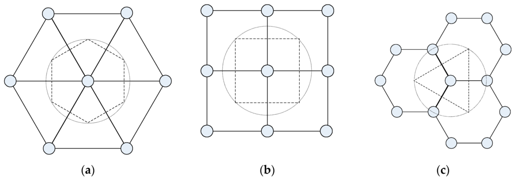 Three common regular patterns of deployment—(a) triangle (3,ε); (b) square (4,ε); (c) hexagon (6,ε), that are under information coverage model.