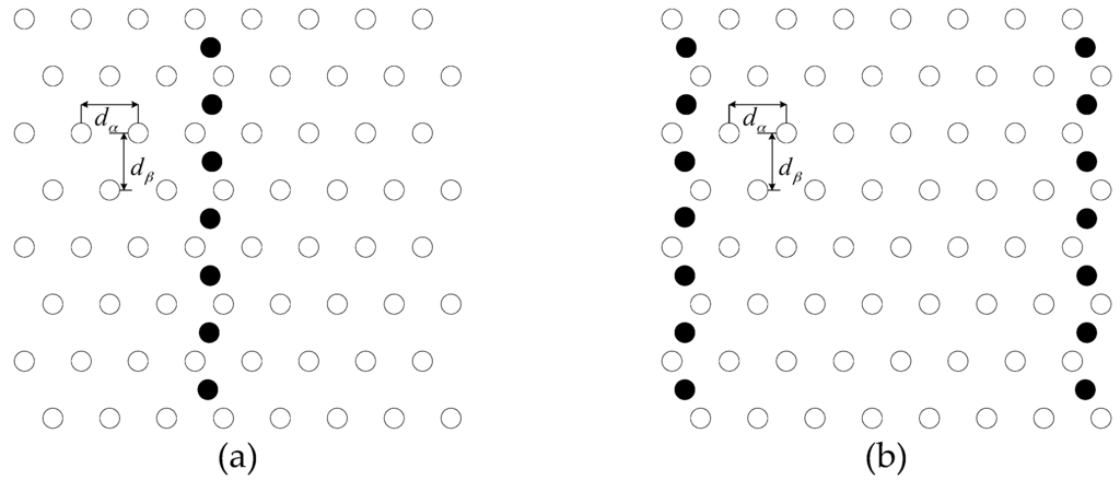 Strip-based deployment for obtaining full coverage with (a) 1-connectivity and 2-connectivity (b), when rc/rs < . The white-filled dots show the sensor positions that form (a) one horizontal strip or (b) two horizontal strips. Here, and . The vertical strip of sensor nodes could be removed when rc/rs < [8].