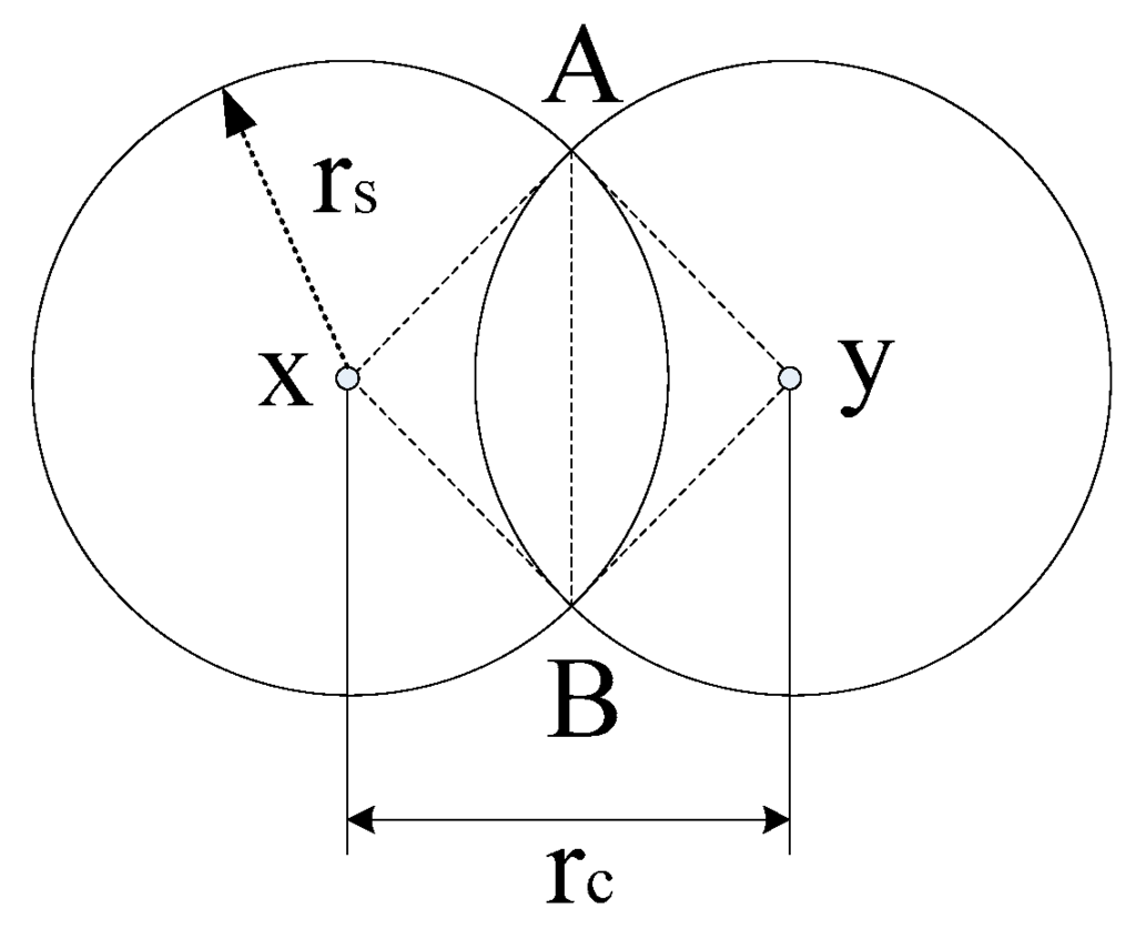 The sensors located at positions x and y are connected with the feature that d(x,y) = rc. Chord AB is the connection chord. and are the connection angles.