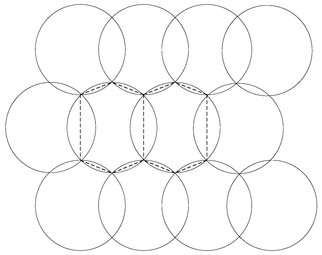It is well-known that placing disks on the vertices of some regular lattice (equilateral triangle, square or hexagon), as illustrated in Figure 1, is an efficient approach achieving full coverage of a two-dimensional region [1,8]. In lattice deployment of WSNs, sensor nodes are designedly and accurately placed at deterministic positions as some regular patterns. This deployment of regular lattice specially suits for deterministic deployment of WSNs, as its convenience and efficiency. As a result, sensors could cover a plane in succession without any overlapping regions.