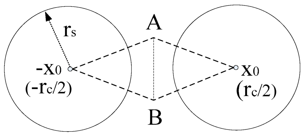 Consider two connected neighboring sensor nodes, that are placed at x and y. Thus, there is a common chord between the disks of their sensing coverage, which are and , that is illustrated by line segment AB in Figure 7. As the positions (x and y) of these two sensor nodes are varied, the length of their common chord varies synchronously. Given the specified values of rs and rc, the shortest possible common chord is addressed as connection chord, and this minimum length is denoted by l(rs,rc). The central angles related to this shortest common chord, at and are called connection angles. We denote these by ϕ(rs,rc). Notice that l(rs,rc) = 0 when rc ≥ 2rs.