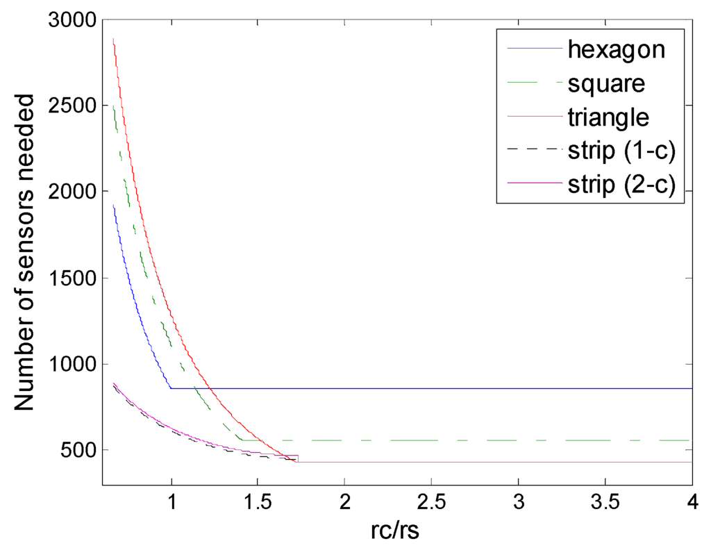 Number of sensors needed in the different schemes of deployment under physical coverage model (hexagon, square, triangle, and strip-based deployment for 1-connectivity and 2-connectivity) to guarantee full coverage and connectivity for various values of rc/rs.