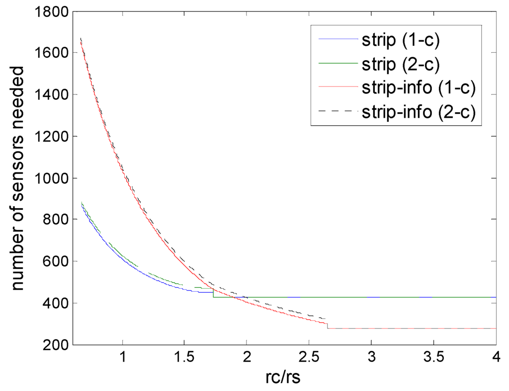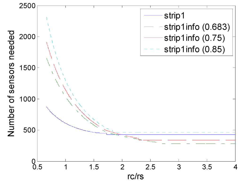Figure 12 shows the comparison of strip-based deployments under physical and information coverage model. First, the numbers of sensors needed by the two strip-based deployments (1-connectivity and 2-connectivity) are very close, despite the fact that different coverage models are used; second, we could find that when rc/rs ≥ 2, strip-based deployments under information coverage outperform the corresponding deployments under physical coverage in terms of numbers of sensors needed, although it is worse when rc/rs is very low. This means that strip-based deployments could be suitable under information coverage, when rc/rs is in the high level, since in this case, the ascendency of the information coverage would be adequately exhibited. This is because when the rc/rs is relatively high, the bottleneck of the deployment is determined by the sensing range, and collaborative data fusion can be used to improve the performance at this time.