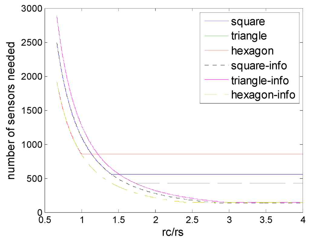 where rc is communication range, for a triangular, a square, and a hexagonal pattern-based WSN for (3,ε), (4,ε) and (6,ε) information coverage respectively. Obviously rc/rs could affect the area of the unit Voronoi polygon for each sensor and the deployment performance.