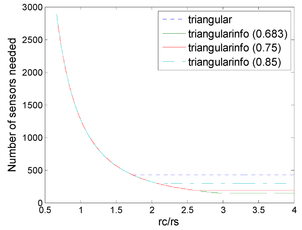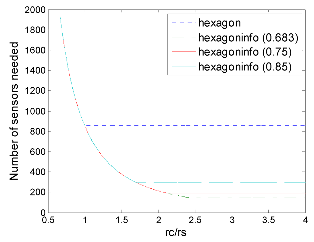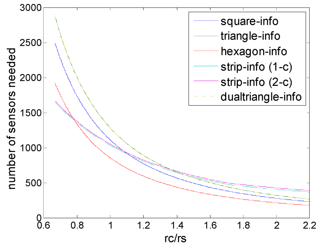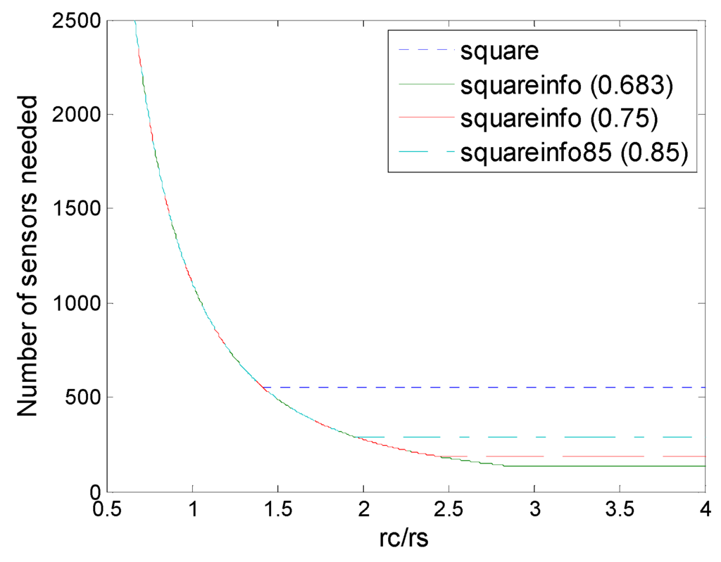 Figure 13 shows the comparison of regular pattern-based deployments under physical and information coverage model. First, for all regular pattern-based deployments, information coverage could be superior to physical coverage currently, in terms of numbers of sensors needed. When rc/rs < 1, rc/rs < , rc/rs < the deployments under information coverage model would be degraded into the corresponding deployments under physical coverage model. That is because when the rc/rs level is low, the communication range becomes the main bottleneck of the deployment, while when the rc/rs level is relatively high, these deployments could break through the bottleneck of the sensing range so that advantages of information coverage could be reflected, at this time regular pattern based deployments under the information coverage are better than those deployments under physical coverage. Figure 13 shows that rc/rs determines the optimal deployment patterns for the sensor density and no pattern is always the best for all the cases. However, it is observed that improvements in sensor density increase as the number of collaboration sensors.