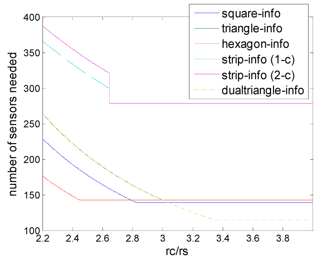 On the other hand, for low level of rc/rs hexagonal deployment also has some advantage when rc/rs < 2.8, and dual triangular pattern outperforms all the other deployments under information coverage, when rc/rs > 3.04, which is shown in Figure 15.