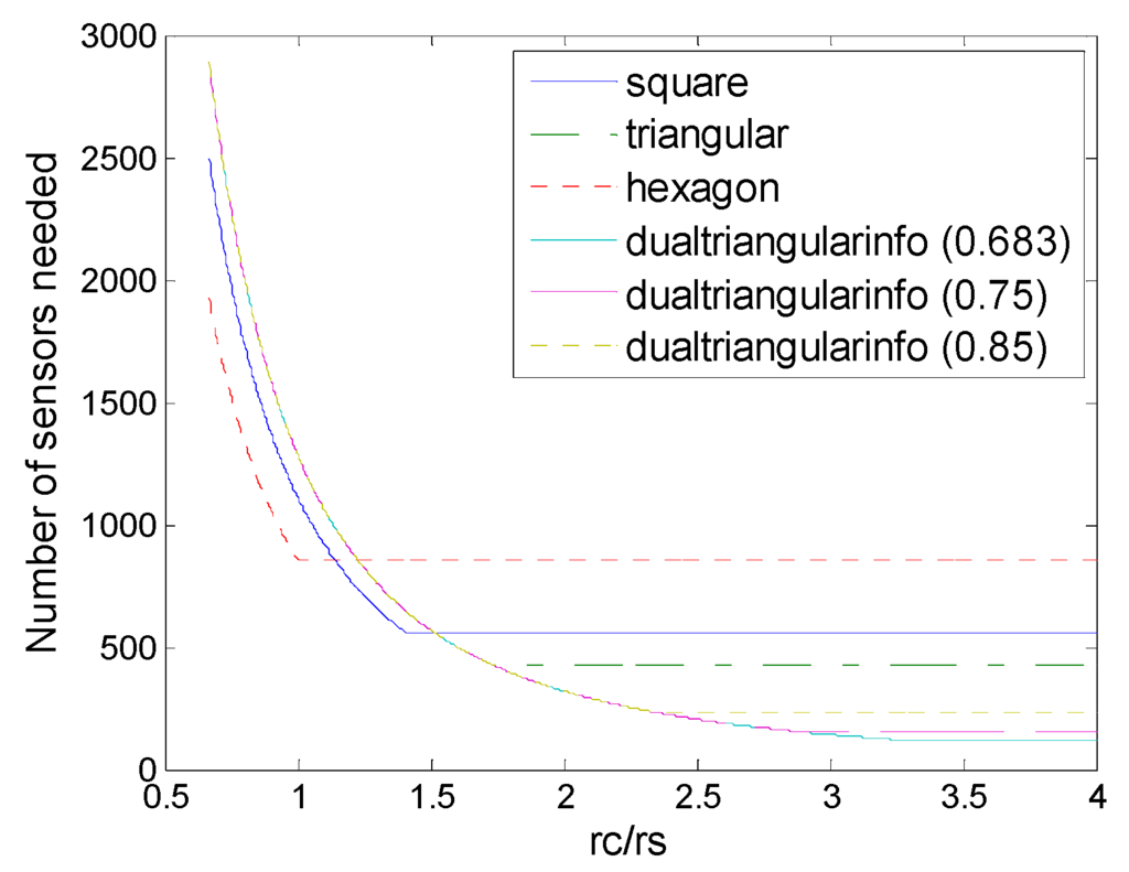 When rc/rs ≤ 3 the dual triangular pattern coincides with the equilateral triangle pattern. The dual triangular pattern outperforms the triangular/square/hexagonal patterns under the information coverage model, while the rc/rs is higher than 3, 3.04 and 3, respectively. In particular, it is observed that when rc/rs increases to a certain high level, the proposed dual triangular pattern deployment could break through the limits on the original triangle, square, and hexagon deployment patterns, and extend the bound on sensor density requirement based on information coverage.
