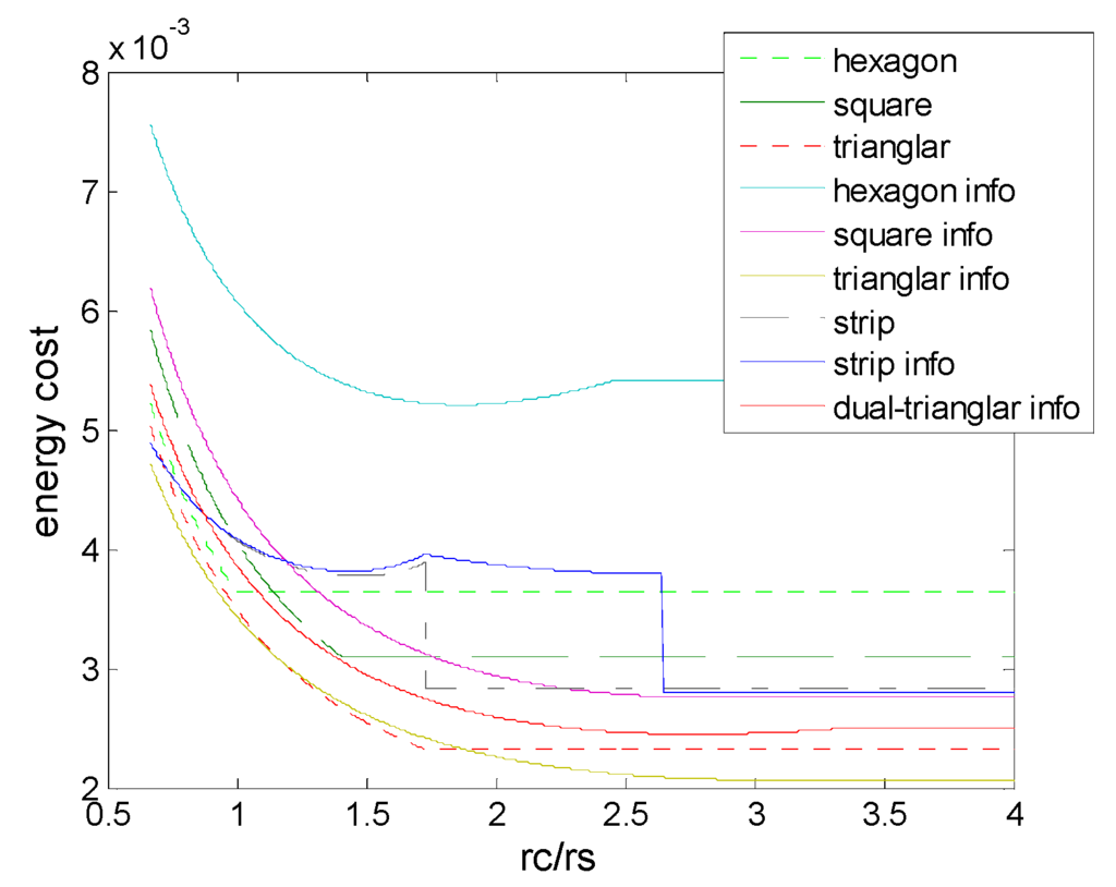Eelec is the energy dissipated per bit to run the transmitter or the receiver circuit, εfs depend on the transmitter amplifier model, EDA is the processing cost of a bit per report to the sink, and we set a 512_bit message that needs to be sent to sink. Figure 21 shows the comparison of total energy cost for all deployments with various rc/rs, where we could see that the deployment in information coverage does not always have the advantage, due to the impact of the energy cost by sensor collaboration. However, we could find that triangle, triangle (3,ε) and dual-triangle (6,ε) outperform the other deployment patterns as it’s the nature of the triangle shape, and the triangle (3,ε) can combine the advantages of two aspects.