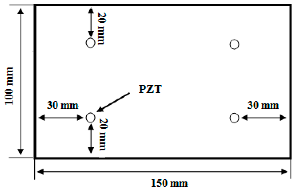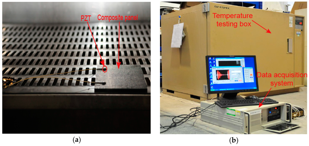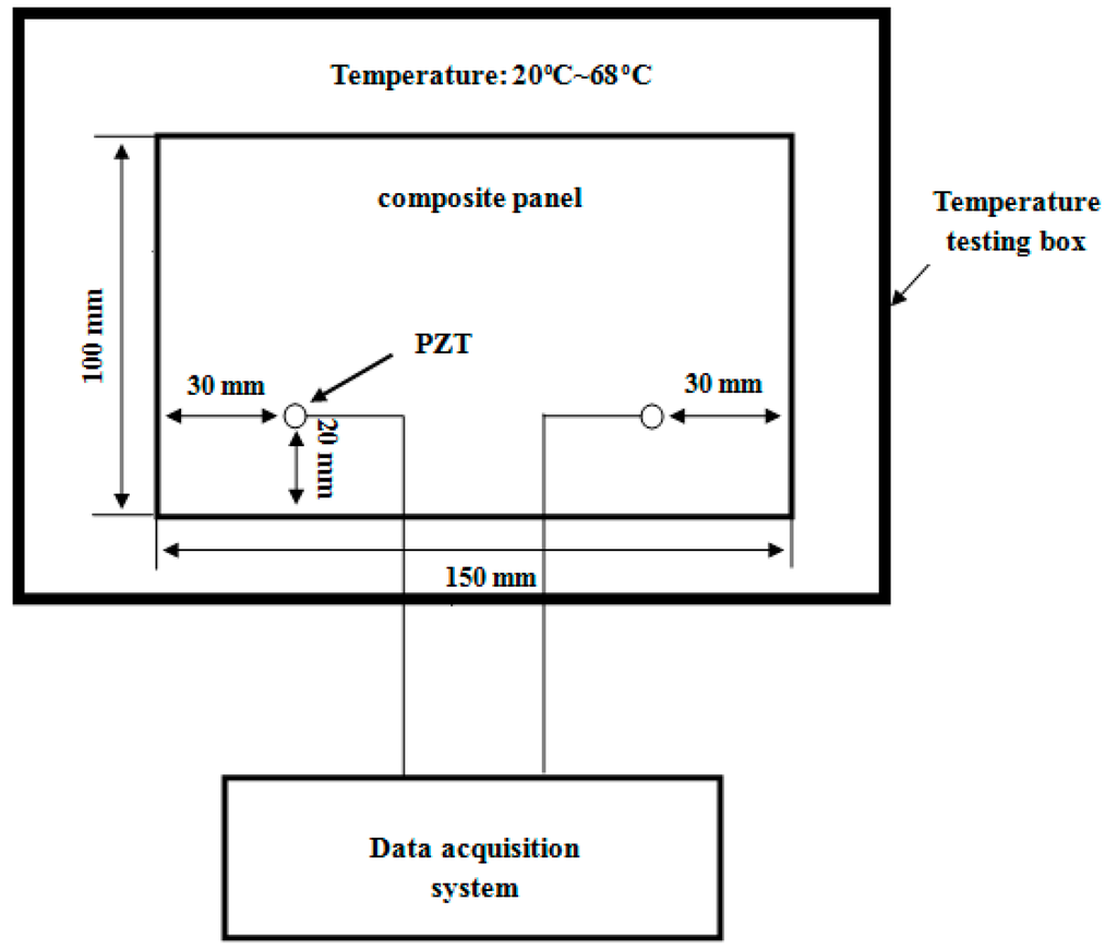 The experiment was carried on a carbon fiber composite panel with the size of 150 mm × 100 mm × 3 mm. The material of composite panel is T700/BA9916. The stacking sequence is [45/0/−45/90/0/45/0/−45/0/45/90/−45]S. The thickness of each layer is 0.125 mm. Two Lead Zirconate Titanate (PZT) wafers were bonded on the specimen with the GLEIHOW302 adhesive. One was used as actuator, the other was used as sensor. The PZT wafers have a diameter of 8 mm and thickness of 0.45 mm. Their positions are shown in Figure 2. The specimen was put into a temperature testing box, where the highest temperature can reach 300 °C with 1 °C accuracy. The experimental setup is shown in Figure 3.