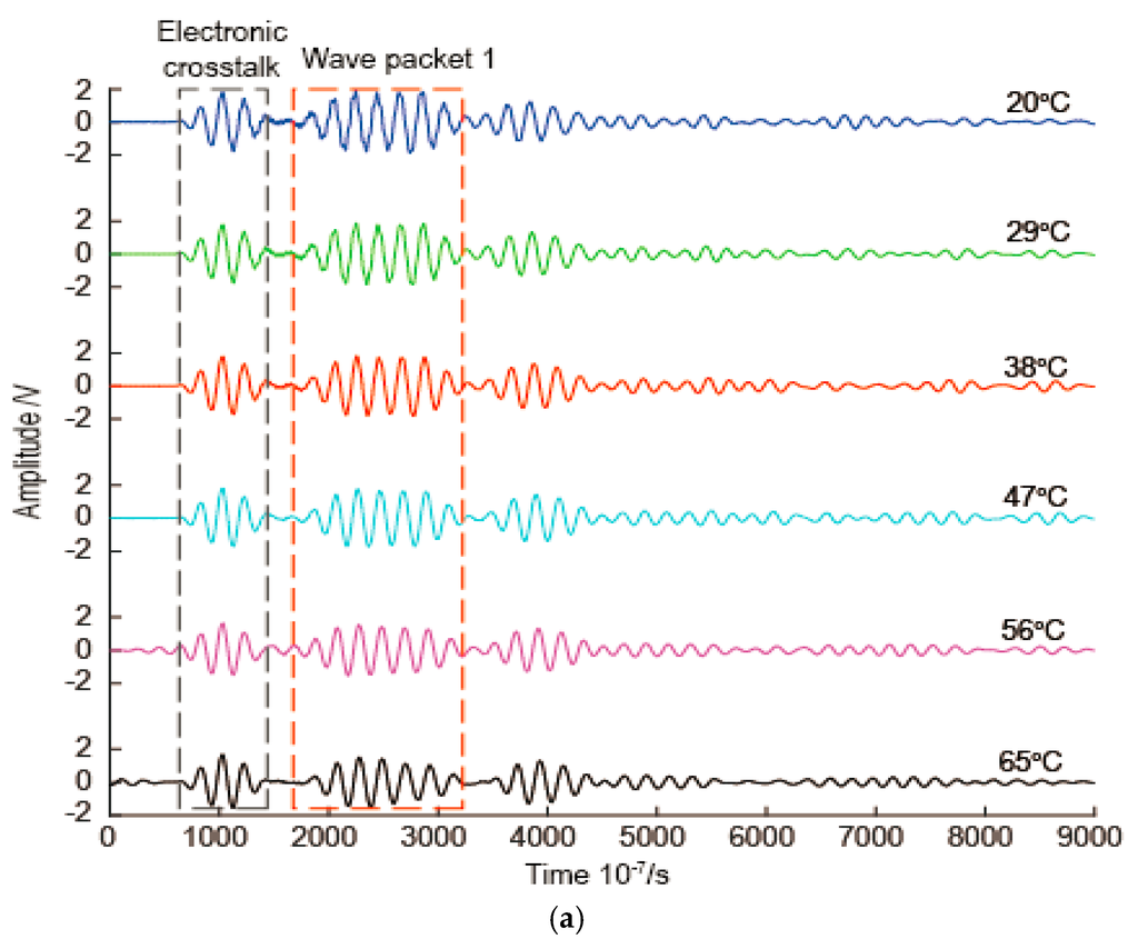 The change in temperature has effects on both signal amplitude and TOF for Lamb wave. For example, signals with frequency 50 kHz for the pitch-catch signal at different temperatures in this study are illustrated in Figure 4. Figure 4a is a waterfall plot of the whole waveform. As shown in Figure 4a, the electronic crosstalk is not affected by the temperature variation, but other parts of the signals are affected by the temperature variation. In order to more clearly observe the effects of temperature, the wave packet 1 of the signals are shown in Figure 4b. In Figure 4b, as the temperature increases, the signal amplitude decreases, and the TOF increases. The temperature compensation is used to decrease these changes caused by the temperature variations.