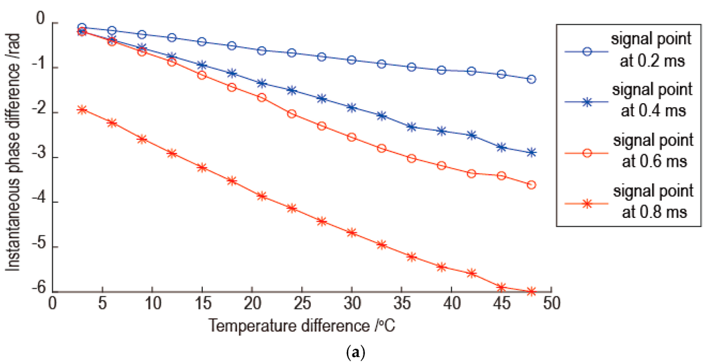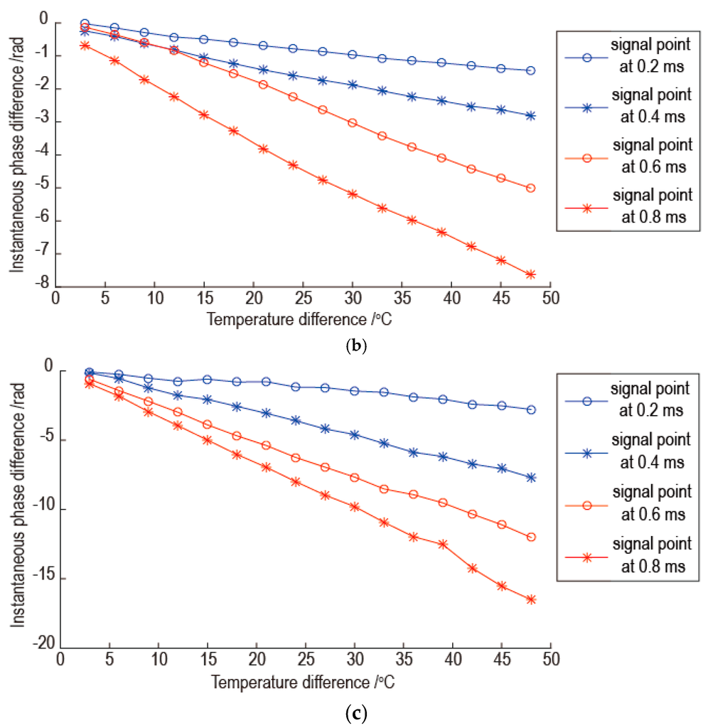 In order to proof hypothesis of the proposed temperature compensation method, the relationship between the instantaneous phase difference and the temperature difference was studied. Using the instantaneous phase of the signals at 20 °C as benchmark, the instantaneous phase differences between signals at other temperatures and the signals at 20 °C were calculated. The calculated instantaneous phases of signals were unwrapped. The relationships between the instantaneous phase difference and the temperature difference for some signal points at three frequencies are shown in Figure 5. In Figure 5a, the signal points at 0.4 ms and 0.6 ms have relatively large deviation from linear relation between the instantaneous phase difference and the temperature difference. In Figure 5b, the signal point at 0.6 ms has a inflection point of linear relation between the instantaneous phase difference and the temperature difference. In Figure 5c, the signal point at 0.2 ms has many deviations from linear relation between the instantaneous phase difference and the temperature difference. From the overall view of Figure 5, although there is little deviation from the linear relation for some points, the instantaneous phase difference is proportional to the temperature difference. So the hypothesis of the proposed temperature compensation method is reasonable.