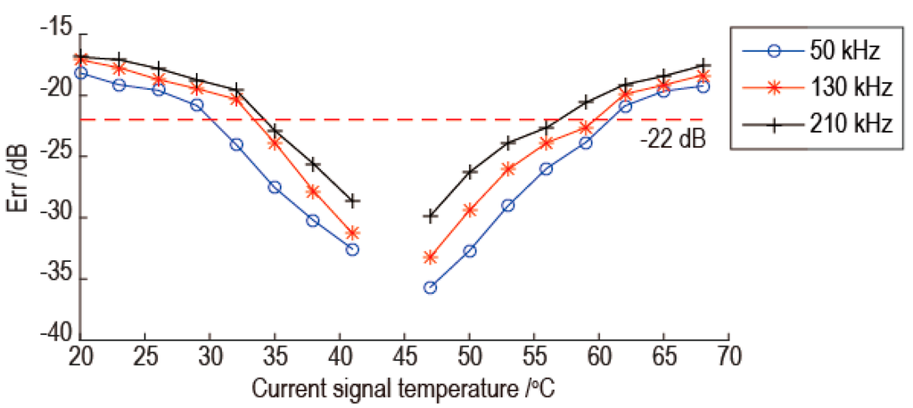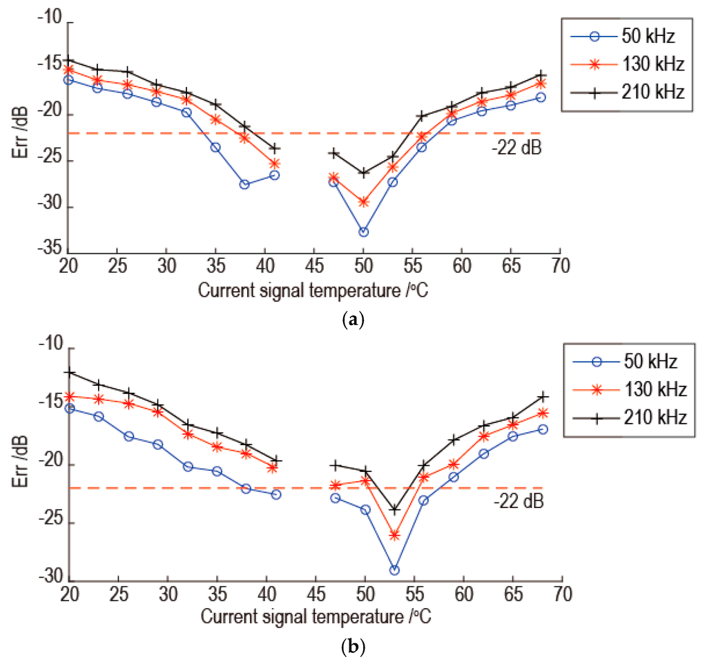 In order to study the effect of temperature difference between the baseline signal and the reference signal on the temperature compensation, the baseline signal temperature is 44 °C and the reference signal temperatures are selected as 50 °C and 53 °C, respectively. The temperature compensation results are shown in Figure 9. By comparing the results of Figure 6 with Figure 9, it can be seen that as the temperature difference between the baseline signal and the reference signal increase, the Err of best temperature compensation at different frequency increases and the temperature interval of the effective temperature compensation at different frequency decreases. So it can be concluded that the temperature compensation is worse as the temperature difference between the baseline signal and the reference signal increase. This is because the error of proportional relation between the instantaneous phase difference and the temperature difference increase, as the temperature difference between the baseline signal and the reference signal increase. In Figure 9, when the current signal temperature is the same with the reference signal temperature, the temperature compensation is best. This is because the current signal is the same as the reference signal. So the instantaneous phase of the two signals is the same.