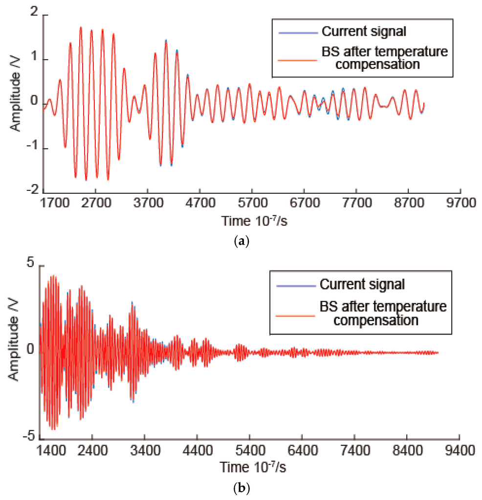 The temperature compensation results using 44 °C baseline signal and 50 °C, 53 °C reference signals: (a) The result using 50 °C reference signal; (b) The result using 53 °C reference signal.