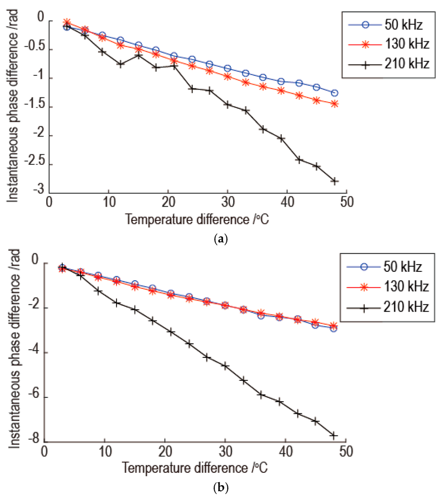 The reasons for the results of Figure 6 are analyzed as follows. As shown in Figure 5, as the temperature difference between the current signal and the baseline signal increase, the proportional relation between the instantaneous phase difference and the temperature difference which is determined by the baseline signal and reference signal becomes worse. So the temperature compensation is worse as the temperature difference between the current signal and the baseline signal increase. As the signal frequency increases, there is more little oscillation for linear relation between the instantaneous phase difference and the temperature difference. This phenomenon can be revealed by comparing the relationship between the instantaneous phase difference and the temperature difference for same signal point at different frequency. Because the part of signal with large amplitude has a great influence on the error of temperature compensation, the signal points at 0.2 ms and 0.4 ms in Figure 5 are used for the comparison. The results are shown in Figure 8. As shown in Figure 8a, there are a few oscillations for linear relation between the instantaneous phase difference and the temperature difference for signals with frequencies of 50 kHz and 130 kHz, but there are many oscillations for signals with the frequency 210 kHz. The oscillation amplitude for signal with frequency 130 kHz is a little bigger than signal with frequency 50 kHz. The phenomenon in Figure 8b is the same with Figure 8a. So as the signal frequency increasing, the temperature compensation is worse and the temperature interval of the effective temperature compensation is reduced.