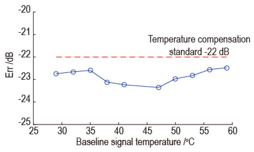 In order to judge the temperature compensation results, is the current signal and is the baseline signal after the temperature compensation. According to common sense, the temperature compensation error should be bigger than the signal noise and smaller than the damage signal. So the lower limit of compensation standard is determined by comparing the two Lamb wave signals obtained in the health state and the damage state. The upper limit of the compensation standard is determined by the minimum ratio of the signal noise to the signal at different temperature. So we simulate the small damage of the composite panel by bonding a bolt with the diameter 5 mm on the panel surface at different position at room temperature. According to the statistical analysis of the experimental results, the typical Err value of residual signal caused by damage is −14.87 dB. The Err value of the minimum ratio of the signal noise to the signal at different temperature is −24.59 dB. Therefore, this study set the Err value as −22 dB for temperature compensation standard.