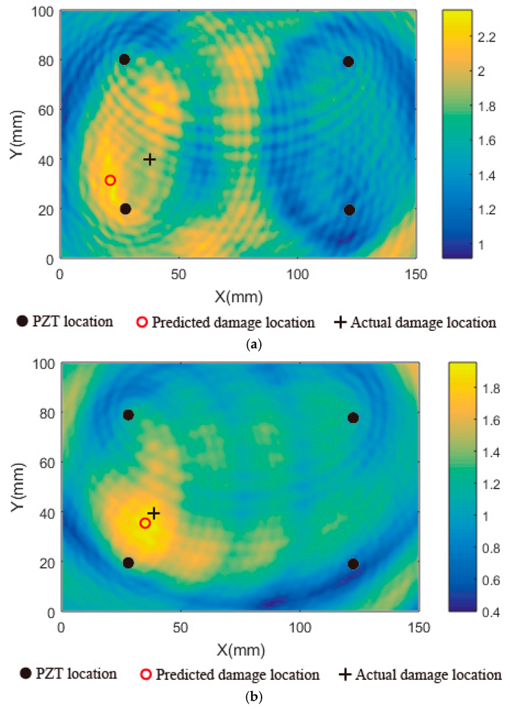 The experimental signals were processed with the delay-and-sum damage imaging algorithm [34]. Under the 70 kHz excitation center frequency, A0 mode amplitude is dominant. So A0 mode was used for damage imaging. The damage detection results are shown in Figure 12. As shown in Figure 12a, the damage was imaged using the baseline signals at 18 °C and the signals obtained at 26 °C in the state with damage. According to the image, the damage location is not clear, and the damage imaging points are very scattered. The predicted damage location is far away from the actual damage location. When the baseline signals at 18 °C were compensated to the current signals at 26 °C using the proposed temperature compensation method, the damage imaging result is shown in Figure 12b. It is clear that the damage location can be determined according to the image result. The predicted damage location is almost consistent with the actual damage location. So it can be concluded that the proposed temperature compensation method can be applied to the actual damage detection.