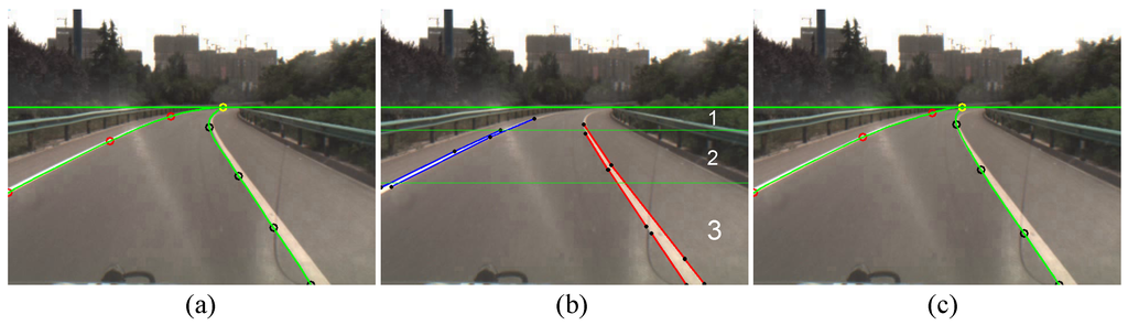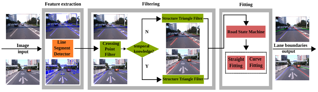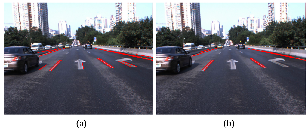 Machine learning methods were recently introduced to feature extraction to overcome those drawbacks [24,25,26,27,28]. The method in [24] trained an artificial neural network classifier to obtain the potential lane-boundary pixels. Such features extracted by an off-line-trained classifier are closely related to the varieties and scales of the training samples. Multiple types of features were fused to overcome the drawbacks of unary features in a previous study [29]. In our work, the LSD algorithm [1] is used to extract lane segment features. This approach can accurately extract line segments in various traffic scenes without manually setting the thresholds.