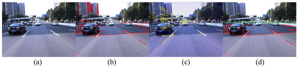 Feature extraction. (a) Original image; (b) Line Segment Detector (LSD) result; (c) Horizontal bands in the image; the yellow points represent the crossing points of line segments; (d) Line segments above the vanishing line are eliminated.