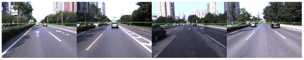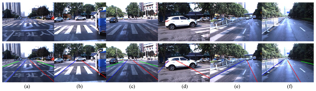 The horizontal symmetry axis of the band with the highest score is considered as the vanishing line. The line segments above the vanishing line are eliminated, and the remaining segments serve as lane boundary features for subsequent processing, as shown in Figure 2d. Some vanishing line detection examples are shown in Figure 3.