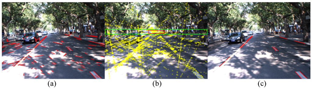 However, a single point is prone to be interfered with by noise and difficult to estimate accurately. Inspired by previous studies that use vanishing points to detect lanes [5,9], we use a bounding box near the vanishing point to refine the line segments. We call this bounding box the vanishing box, as the red box shown in Figure 4b. A line segment is filtered out if all of the crossing points of this segment with other segments are outside the vanishing box. Figure 4c shows that many noisy line segments are filtered out.
