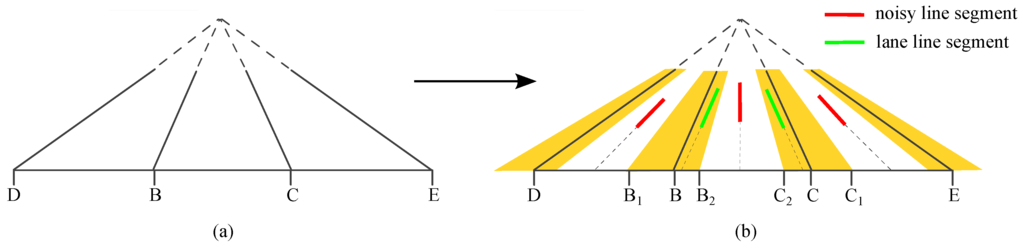 It should be noted that the estimated B, C, D and E are not the intersection points of real lane boundaries with the image’s bottom line. After filtering out noisy line segments with STF, the remaining line segments are used to estimate real lane boundaries, which will be detailed in Section 5.