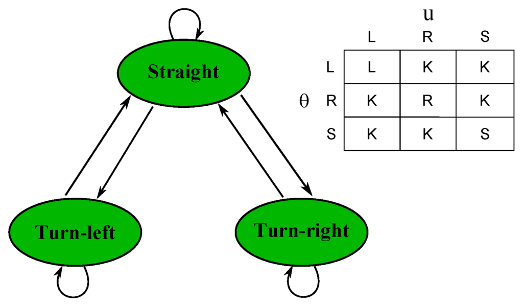 The state machine includes three states: turn-left road, turn-right road and straight road, as shown in Figure 7. We assume that the state cannot directly transfer between ‘turn-left’ and ‘turn-right’ in two consecutive frames. The road state is jointly decided by two types of measures. Only if the two measures indicate the same state, the state of the current road is assigned the indicated state. When the two measures indicate different states, the current road state is assigned the state in the last frame.