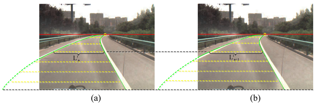 We use Figure 8 to illustrate Equation (9). The green curves in Figure 8a are the lane boundary results in the n-th frame, and the curves in Figure 8b are the results in the -th frame. The red line is the vanishing line, and the yellow dotted lines represent the lane width in different rows. m is the number of rows between the vanishing line and the bottom line. is the width of the lane in the i-th row of the n-th frame, and is the width in the same row of the -th frame. is a penalty factor, which is defined as , where is the width of the lane on the bottom line of the image in the n-th frame.
