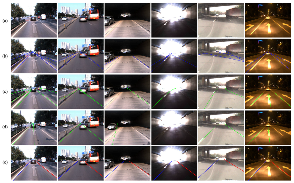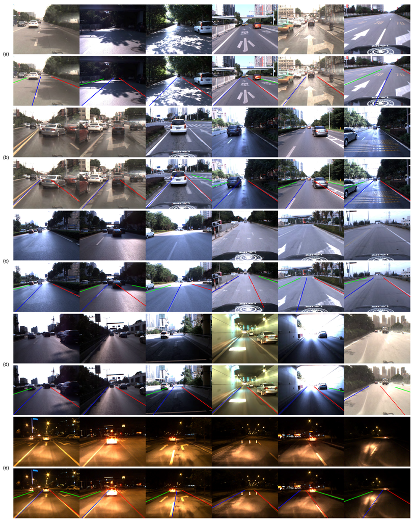 Examples of lane detection in various scenes. (a) Roads with shadows and paint; (b) Vehicle disturbance; (c) Worn lane boundaries; (d) Complex illumination; (e) Night.