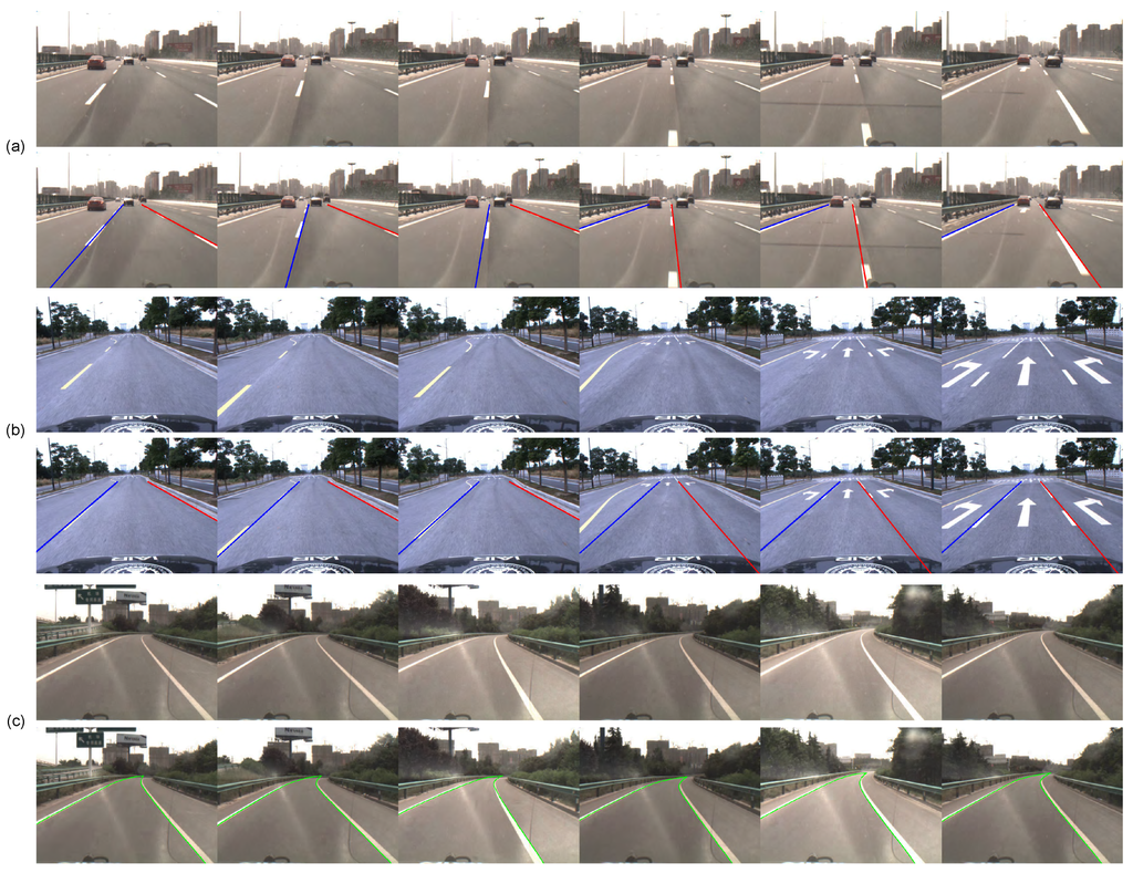 Examples of lane detection in road structure changes. (a) In the process of changing lanes; (b) Lanes suddenly become narrow; (c) Curved roads.