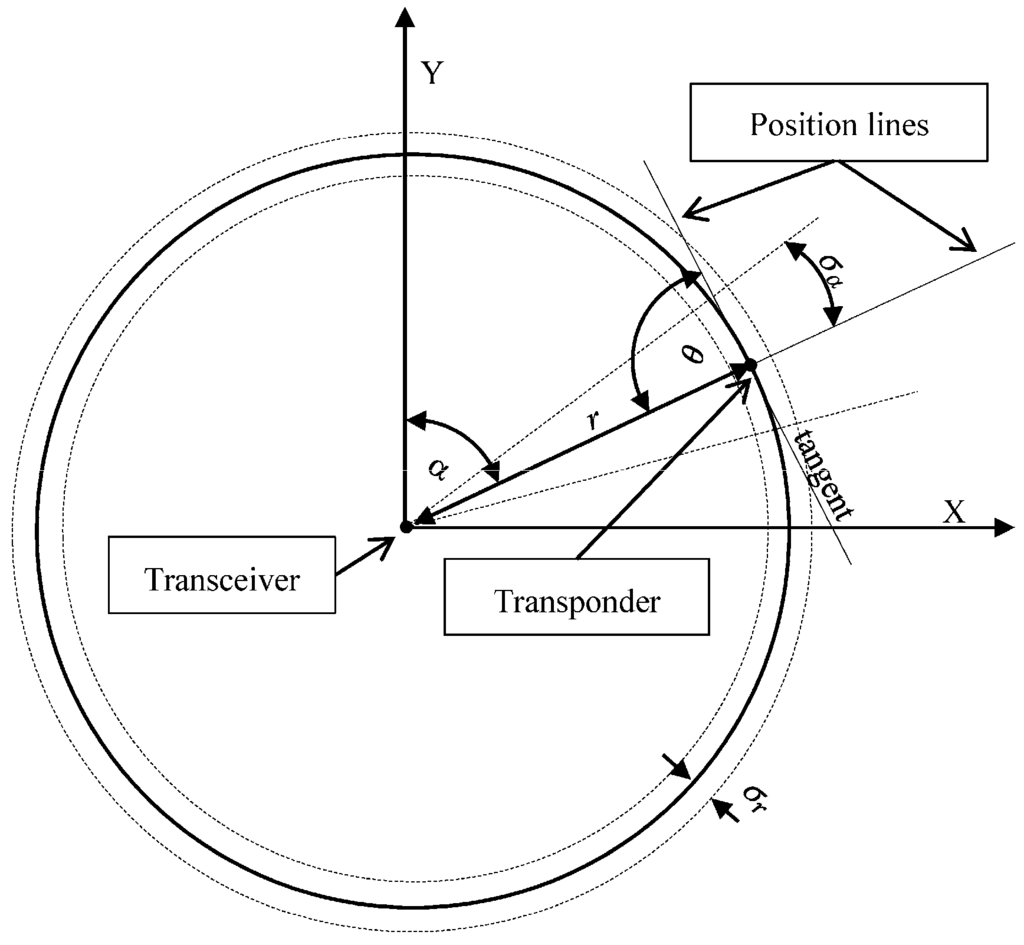 where —the intersection angle of the position lines. In the case of USBL it always equals 90°; —α (yaw) mean measurement error; — (distance) mean measurement error; —distance between the Transceiver and Transponder; —the length of the major axis of the mean error ellipse; —the length of the minor axis of the mean error ellipse.