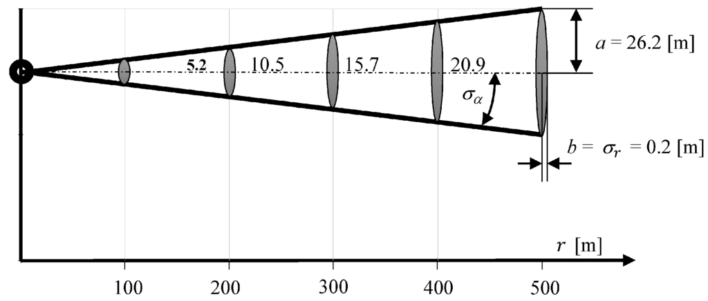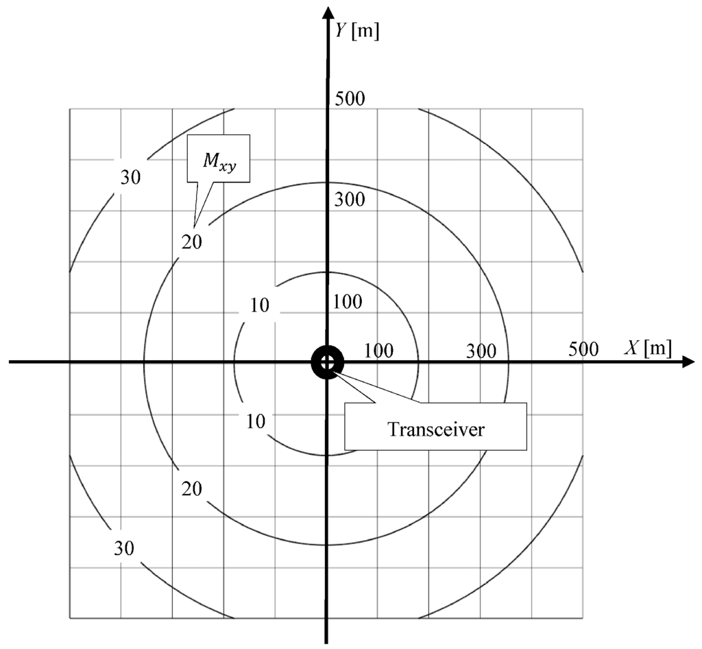 Based on the dependence Equation (5), information provided by the manufacturer, and the values of the mean errors of measurement, i· m, an area map has been compiled on the accuracy of position coordinates, determined by the Tritech USBL “MicronNav System” (Figure 3) [24].
