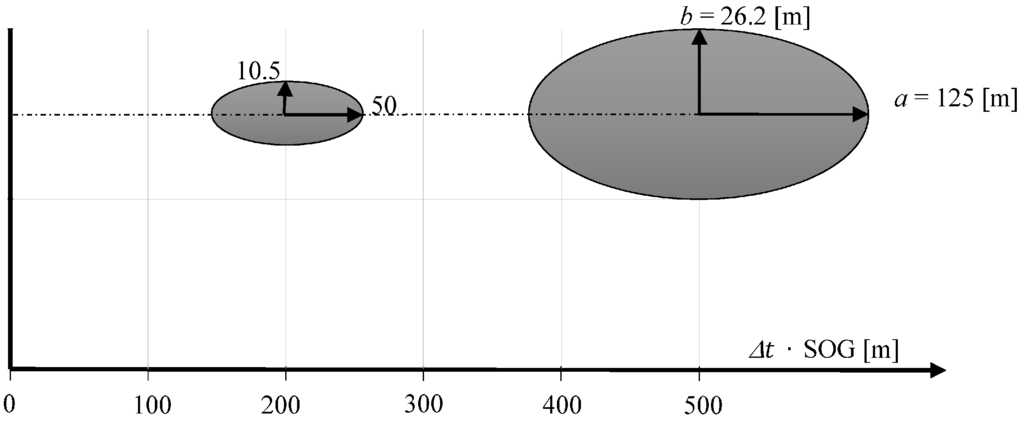Figure 6 shows that the largest coordinate error occurs in the direction according to COG. The length of the axis b is equal to the length of the mean error ellipse of coordinates determined using USBL system (Figure 4). This is due to the fact that in both methods of determining the position coordinates the positioning line is a result of the direction measurement that is burdened with the same error value .