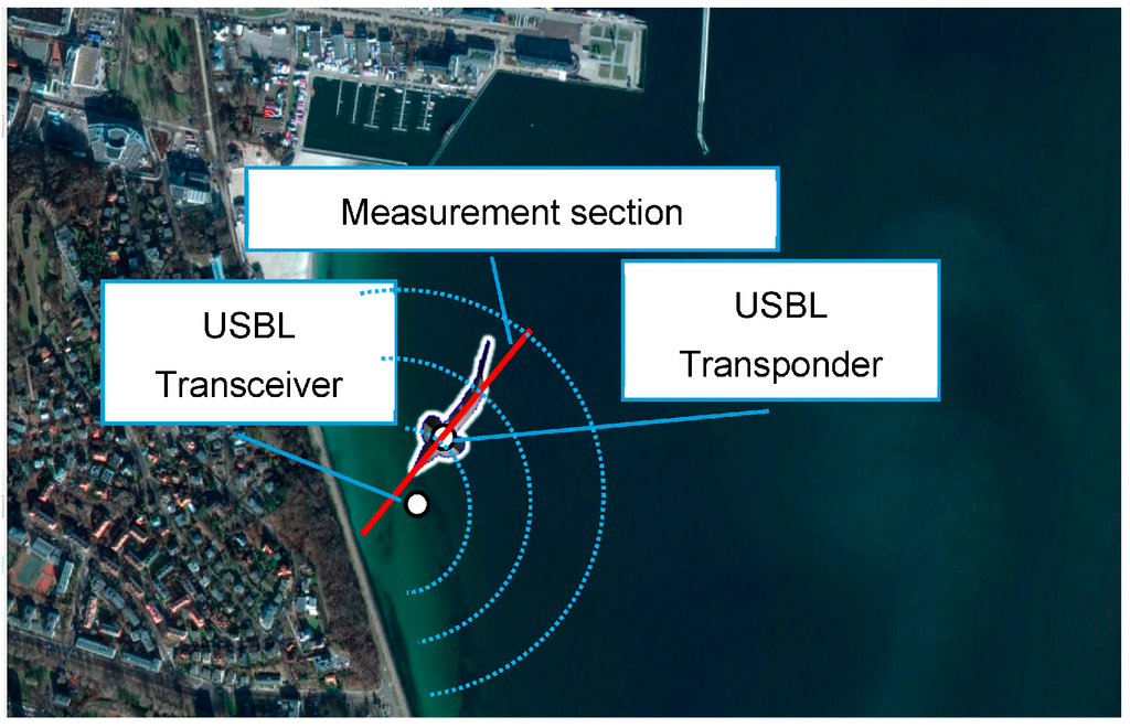 Reference measurements of the USBL system , , will be determined relative to the reference positions consecutively occupied by the BAUV, which moves with undisturbed movement. On the other hand, the BAUV reference position will be dead reckoned (DR) on the basis of reference , and , which will be located exactly at the measuring section (see Figure 7).