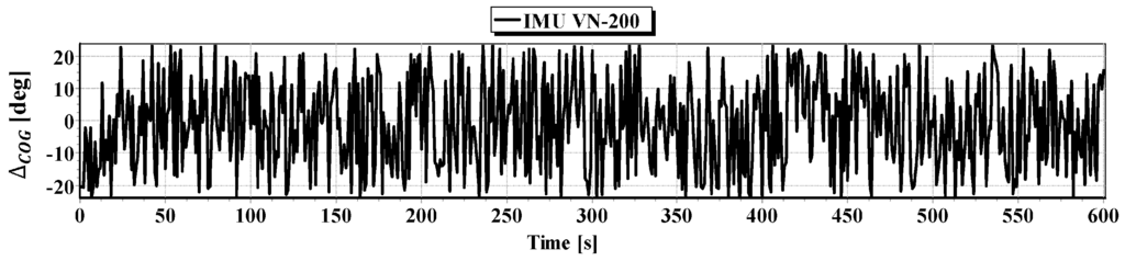 If the impact of current, drift, and waving of sea on the BAUV movement can be avoided, the only sources of errors are the devices used to dead reckoning. In the case of the BAUV, these are the Inertial Navigation System, INS “VN-200”, which determines course over ground (COG) [21] and the electromagnetic log “ALIZE”, which determines speed through water (STW). In this case, the STW is equal to the speed over ground (SOG) [22].